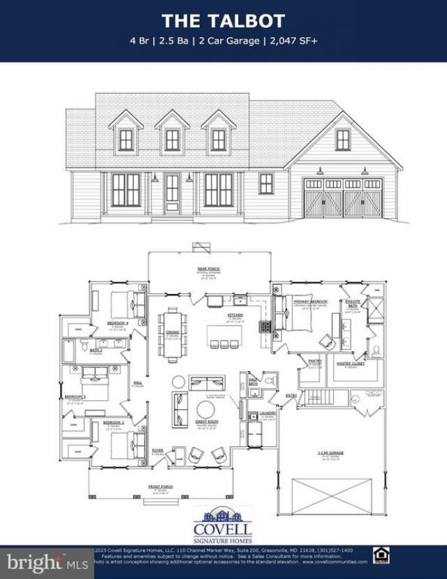 STUNNING NEW CONSTRUCTION located within the highly sought-after water-access community of Queen Anne’s Colony. Welcome to the Talbot, a beautifully designed, single-level residence offering over 2,000 square feet of thoughtfully designed living space, complete with 4 bedrooms and 2.5 baths. This exceptional coastal Craftsman-style home on Kent Island blends modern luxury, elegant design, and upscale finishes. The exterior showcases HardiePlank lap siding, signature Craftsman-style double columns, and a full-length front porch that creates inviting curb appeal, along with upgraded front and garage doors that enhance the home’s character and charm. Inside, the open-concept kitchen is beautifully designed, featuring upgraded cabinetry with dovetail construction and soft-close doors and drawers, quartz countertops, and a high-end GE Café appliance package. Additional highlights include a custom trim package that includes a brick-surround fireplace flanked by custom built-in shelving units, a soaring cathedral ceiling in the Great Room with white painted beams and shiplap trim, durable luxury vinyl plank flooring throughout the main living areas, and beautifully tiled shower surrounds, offering both style and functionality at every turn. Enjoy an unbeatable location with stunning water views, peaceful streets, and a true sense of community. Keep your boat at Queen Anne Marina within the neighborhood, take a leisurely stroll to the adjacent Blue Heron Golf Course and enjoy being just minutes from a variety of exceptional waterfront dining and local restaurants. Incredible opportunity you won't want to miss!